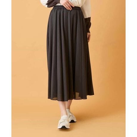 全体に施したかまぼこプリーツで存在感がありながら、どんなトップスにも上手にマッチする使い勝手の良いひと品です。ウエストは総ゴム仕様で着脱しやすく、ソフトフィットな穿き心地も嬉しいポイント。裾のシアー感がさりげない気品を纏い女性らしい軽やかな着こなしを演出します。同素材で仕立てたブラウス【R6BED50260】と合わせたクラシカルなセットアップスタイルもおすすめ。