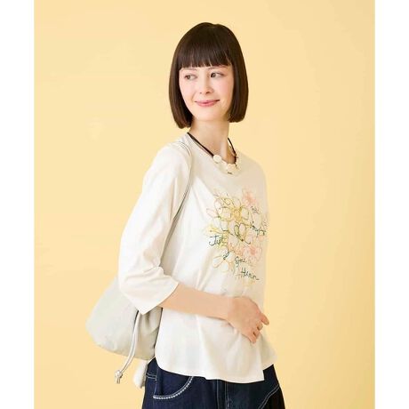 スパンコールやグリッター、刺繍ディテールを組み合わせた煌きあるフラワーモチーフが印象的な一枚。タイポグラフィがリズミカルにアクセントを加え、大人カジュアルな雰囲気を演出します。コンパクトな七分袖とチューリップスリットを施した丸みのあるヘムラインも特徴的。一枚ではもちろん、ジャケットインにも重宝する着回し力の高いアイテムです。