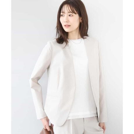 程良くゆとりを持たせたサイズ感のカラーレスジャケット。ストレッチの効いた素材は着心地の良さがポイント。ネックをきれいに見せる衿ぐりのラインや、すっきりとしたフロントデザイン、見返しを付けたインサイドポケットなど、細部までこだわったジャケットです。
