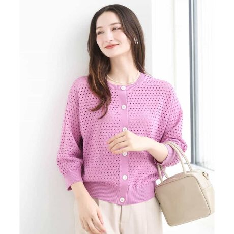 インナーのカラーレイヤードも楽しめる、ドット風のアイレット編地のニットトップス。ボディラインを拾いにくい適度な肉感で、どちらを前にしても着こなせる前後2wayデザインです。前立ての大きめな白釦がアクセントに。