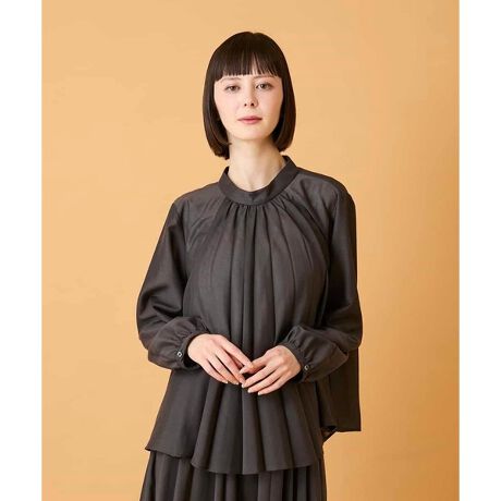 フロントに施したかまぼこプリーツが存在感を放ち、一枚合わせるだけで印象的な着こなしを叶えます。サイドのダーツで奥行きを効かせ、程よい高さのスタンドカラーがシックで知的な佇まいを演出。シアーな表情が気品を纏い女性らしい軽やかな着こなしを演出します。同素材で仕立てたスカート【R6HED51290】と合わせたクラシカルなセットアップスタイルもおすすめ。