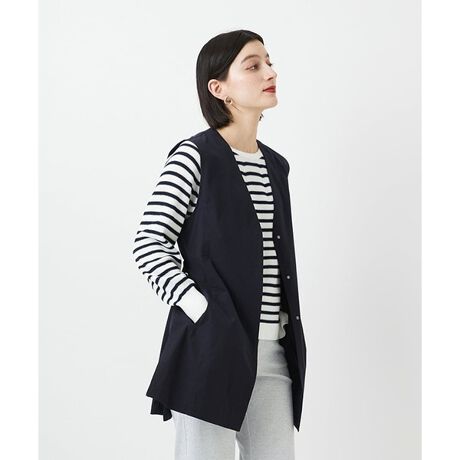 シンプルなフォルムの中にジグザグステッチやサイドのミニベルトなど細かいディテールに拘ったデザインのジレです。サイドのミニベルトはウエストサイズを調節することができ、お好みに合わせたシルエットをお楽しみいただけます。ロング丈なので気になる下半身をカバーしてくれ、さらにIラインシルエットが強調されてスタイルアップ効果が期待できる一着です。襟はノーカラーで軽やかな印象ながらも、きちんと感を演出してくれます。