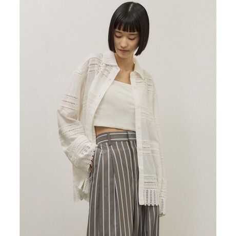 総柄の刺繍生地を使用したリラックスシルエットや、裾や袖口のスカラップが魅力のシャツ。