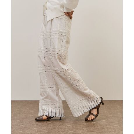 総柄の刺繍生地を使用したリラックスシルエットや、裾のスカラップが魅力のイージーパンツ。