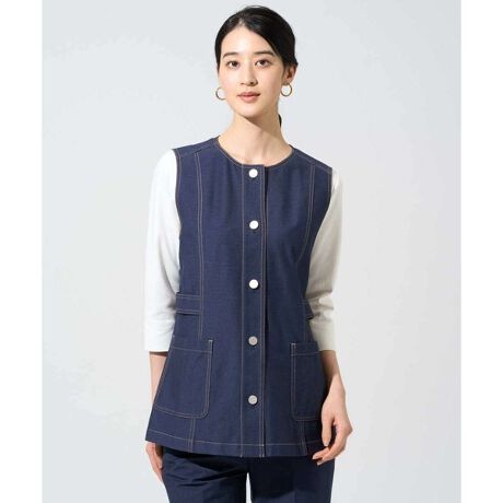 配色のダブルステッチがポイントのノーカラーの襟元が美しい前開きタイプのジレ。スッキリとしたプリンセスラインが体のラインを綺麗にカバーします。