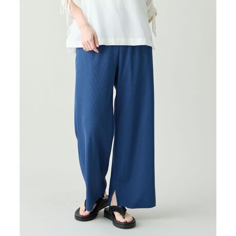 ・ボディラインを拾いにくい、ハリのあるジャージー素材を使用したイージーパンツ・内側スリット入りでニュアンス感のあるデザイン