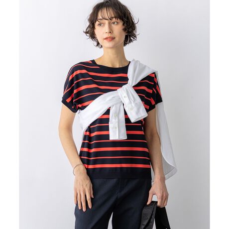 袖付けの切り替えをなくすことで、肩周りに優しくなじみ、ストレスフリーな動きやすさを実現したプルオーバーです。Tシャツのような感覚で気軽に着られますが、ニットならではの上品な素材感により、カジュアルになりすぎず大人っぽい印象を与えます。やや長めの着丈で、パンツにもスカートにも合わせやすく、裾はアウトでもインでもすっきりと決まります。程よいゆとりがありながらも、ジャケットのインナーとして着用してももたつかず、通勤スタイルにも最適です。カラーは、着回しやすいホワイト(#001)、ブラック(#005)、ネイビー(#075)などのベーシックカラーに加え、柔らかなピンク(#012)やスカイブルー(#072)、ニュアンス感のあるダークブラウン(#035)、さらにコーディネートのポイントになるオフ×ベージュ(#101)、ダークモカ×ネイビー(#130)、ネイビー×キャロット(#175)などのボーダー柄を含む、全10色の豊富なバリエーションで展開しています。