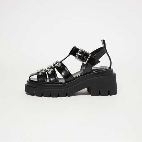 甲のベルト部分にさまざまな形のビジューを散りばめた、存在感を放つグルカサンダル。