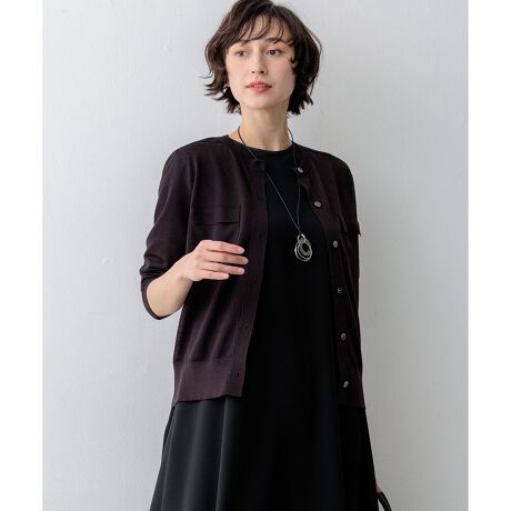 程よいシアー感をベースに、肩のヨーク切り替えや胸元のフラップポケットで上品にメリハリをつけたクルーネックカーディガンです。羽織りとしてはもちろん、ボタンを閉めてプルオーバーのように一枚着として着こなしても、きちんと感があり様になる着映えアイテムです。手首がのぞく軽やかな袖丈が、手元に女性らしい抜け感を演出します。フレアスカートと合わせたフェミニンなスタイルから、デニムやワイドパンツと合わせた大人のカジュアルスタイルまで幅広く活躍します。カラーは、WEB&一部店舗限定のやわらかな色味のピンク(#012)と鮮やかなトーンのブルー(#070)に加え、肌なじみの良いアイボリー(#003)、シックで万能なブラック(#005)、落ち着いた深みのあるダークブラウン(#035)、上品で知的なネイビー(#075)の豊富な6色展開です。