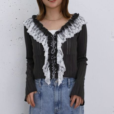 ・フロントにたっぷり施されたレースフリルが目を引くカーディガン