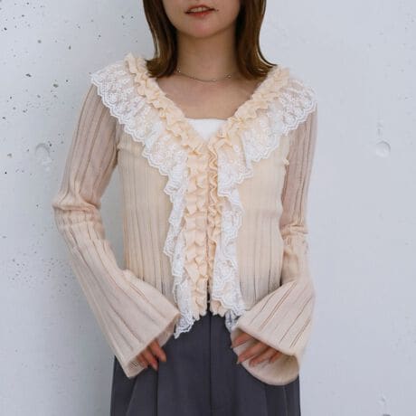 ・フロントにたっぷり施されたレースフリルが目を引くカーディガン