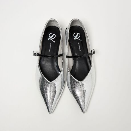 シルバーは、メタリック素材にエナメル素材の甲ベルトを組み合わせています。
