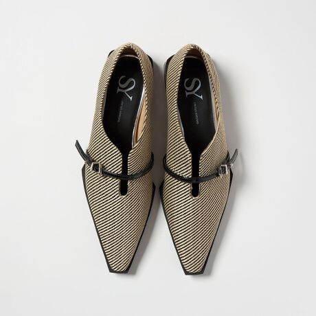 アッパーのスリットと細いベルトが目をひくフラットシューズ
