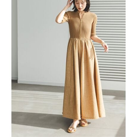 ニットトップ×布帛スカートのドッキングワンピース。