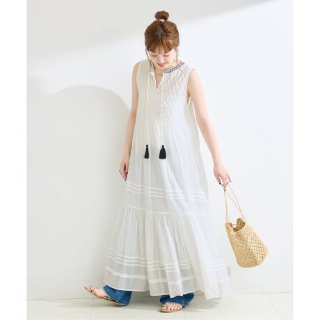軽さのある素材にティアード&幅広タックデザインが表情があり、歩くたびにふんわり揺れる女性らしいシルエットに仕上げました。上半身はノースリーブですっきりと見せ、裾向かって広がるシルエットが華やかな印象です。タッセルの紐もアクセントになり着るだけで着映えするアイテムです。