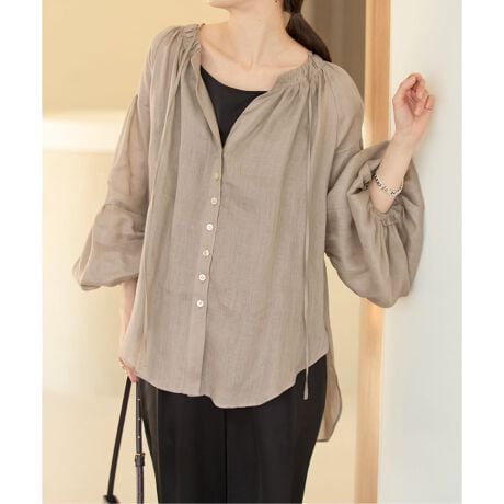 柔らかい素材感を活かし、今シーズンはブラウスをご提案。襟ぐり、袖に贅沢に施したギャザーが程よく甘さをプラスしてくれます。