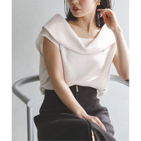 オフショル風の襟がポイントで、程よく開きデコルテラインを美しく演出。バックネックに施したチェーンがアクセントになっており、さりげない金具の煌めきがよりエレガントに映してくれます。