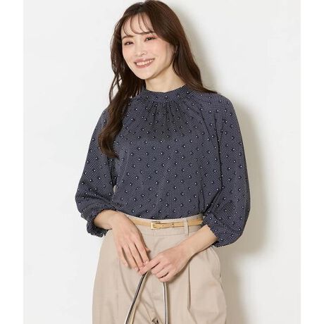 上品な柄行きで、日常からセレモニーまで頼れるきちんとブラウス。甘さを抑えたクラシカルなドットプリントで、通勤からきちんとしたお出かけ・セレモニーシーンまで幅広く対応します。軽やかな素材感とふんわりとしたシルエットが、装いに上品な動きを添えてくれる着映えトップスです。ジャケットインとしても着回しやすいベーシックなホワイト・ネイビーの2色展開。