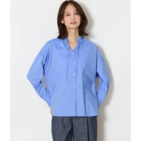 顔周りを優しく彩るフリルカラーが印象的な、大人のための着映えブラウス。甘くなりすぎないデザインバランスで、通勤からオケージョン、カジュアルスタイルまで幅広く活躍します。一枚でもサマになり、ジャケットインでも映える、頼れる主役級トップスです。ベーシックに着まわせる定番のホワイト、知的で爽やかなニュアンスをプラスしてくれるサックスの2色展開です。