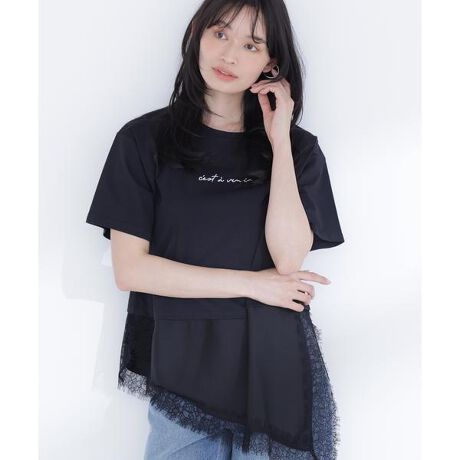 ボクシーシルエットに異素材をドッキングしたロゴTシャツ。裾はトレンド感のあるレーストリミングサテンを使用したイレギュラーヘムで、カジュアルさに女性らしさをプラス。ヒップまわりをさりげなくカバーするレイヤード風デザインは、一枚で着映えながら涼しく着ていただけます。<素材>コットン混の天竺カットソーとサテン素材を使用しています。<詳細>仕様・開閉なし裏地・なし透け感・なし / 光沢・なし / 伸縮性・あり生地の厚さ・普通※モデルの着用画像の場合、光の当たり具合により、実際の色味と異なって見えることがございます。色味は、商品単体の画像をご参照ください。