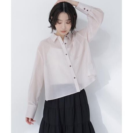 ショート丈のボクシーシルエットがポイントのシアーシャツ。配色の貝調ボタンがアクセントになっています。軽やかなシアー素材で、一枚着でも軽い羽織りとしても活躍。ショート丈なのでワイドパンツからナロースカートまで着回せます。<素材>軽やかで程よい透け感のある合繊シアー素材を使用しています。<詳細>仕様・前ボタン裏地・なし透け感・あり / 光沢・なし / 伸縮性・なし生地の厚さ・薄手※モデルの着用画像の場合、光の当たり具合により、実際の色味と異なって見えることがございます。色味は、商品単体の画像をご参照ください。