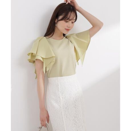 動きのあるボリュームラッフルが目を引くニットトップス。タフタ素材の二重ラッフルが華やかな印象を与え、キレイめからカジュアルまでコーディネートのアクセントとして活躍します。ニット部分には清涼感のある糸を使用しており、これからのシーズンも快適な着心地。存在感がありながら、幅広いスタイリングに取り入れやすい一枚です。