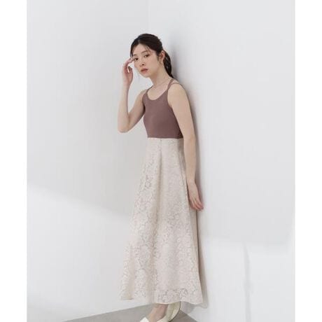 レーススカートをドッキングしたニットキャミワンピース。上身頃はニット、後ろはゴム仕様で動きやすくデイリーに着用いただけます。二重の肩紐は首元でリボン結びができるのもポイント。さりげない配色が大人っぽく、軽い羽織りも合わせやすい一枚です。