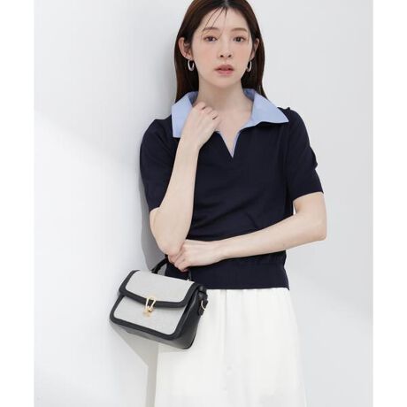 襟元からシャツ素材がのぞくコントラストがお洒落なポロニット。テクニックいらずで、目を引く洗練された印象に仕上げています。体のラインを拾いすぎず、程よくゆとりのあるシルエットで着心地も快適。カジュアルすぎずオフィスシーンにもおすすめです。襟は固定されているため取り外し不可です。
