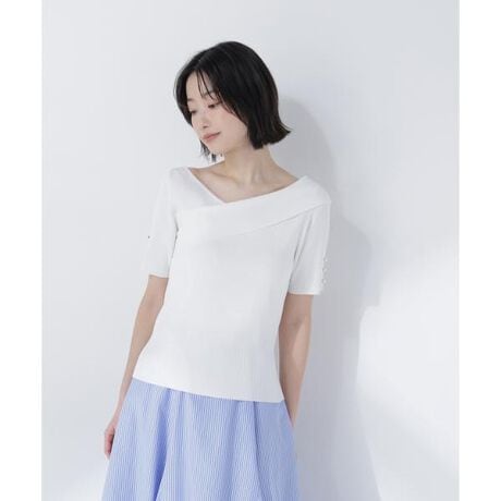 デコルテを美しく見せるネックデザインが女性らしく、顔まわりを華やかに見せるリブニット。袖口のキラッと輝くボタンでさりげないアクセントをプラス。程よくフィットするリブ素材が縦のラインを強調し、すっきりとしたシルエットを演出します。<素材>清涼感のある素材のリブ編みニットです。<詳細>仕様・開閉なし裏地・なし透け感・なし / 光沢・なし / 伸縮性・あり生地の厚さ・普通※モデルの着用画像の場合、光の当たり具合により、実際の色味と異なって見えることがございます。色味は、商品単体の画像をご参照ください。