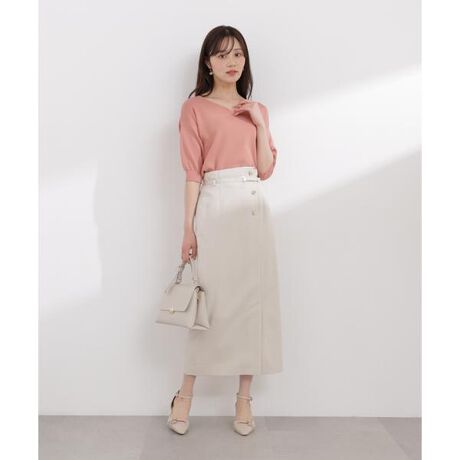 フロントのニュアンス釦がポイントのIラインスカート。定番として使いやすいシルエットに、ウエスト上部のカッティングやニュアンス釦など、程よいデザイン入りでシンプルになりすぎない一枚に。共地ベルト付きで、ウエストマークがすっきり決まります。オン・オフ問わず、幅広いシーンで活躍してくれます。