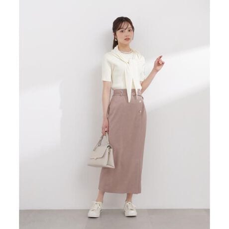 フロントのニュアンス釦がポイントのIラインスカート。定番として使いやすいシルエットに、ウエスト上部のカッティングやニュアンス釦など、程よいデザイン入りでシンプルになりすぎない一枚に。共地ベルト付きで、ウエストマークがすっきり決まります。オン・オフ問わず、幅広いシーンで活躍してくれます。