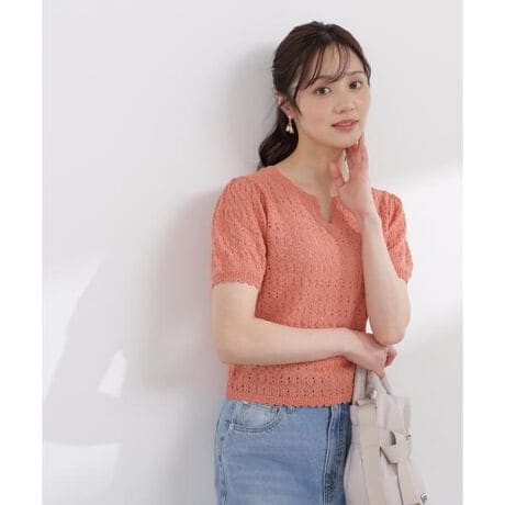 これからの季節にぴったりな透かし編みニット。透かし編みニットには珍しいヘンリーネックで、トレンド感のあるデザインです。パフスリーブが程よいフェミニンさをプラスし、フェミニンなコーディネートとも相性抜群。涼しげなボーダー柄に加えて、目を引くラベンダーやオレンジの華やかなカラーも魅力です。