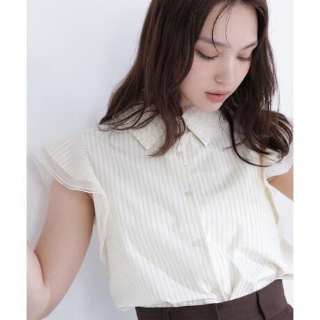 襟のチュールフリルが目を引くデザインシャツ。繊細なチュールが顔まわりを華やかに見せ、コーディネートに上品な甘さをプラスします。一枚で着映えし、キレイめにもカジュアルにも幅広く活躍します。<素材>ややハリ感のあるシャツ地を使用しています。<詳細>仕様・前ボタン裏地・なし透け感・ややあり / 光沢・なし / 伸縮性・なし生地の厚さ・普通※モデルの着用画像の場合、光の当たり具合により、実際の色味と異なって見えることがございます。色味は、商品単体の画像をご参照ください。