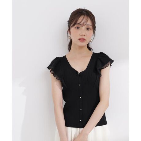 袖先ラッフルにシアー素材をあしらった華やかなニットトップス。ラッフルの動きとシアーな透け感が目を引くデザインです。甘さをほどよく抑えた金属ボタンがアクセント。スカートはもちろん、デニムなどカジュアルパンツとも着回せます。