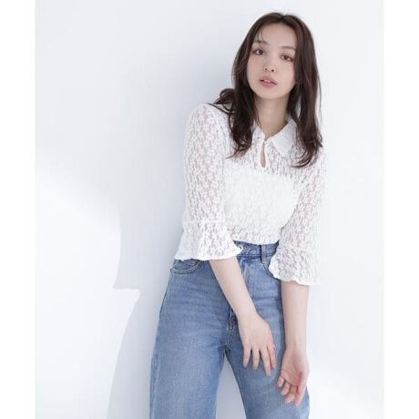 繊細で甘さ控えめなレース柄が魅力のストレッチレースカットソー。シャツカラーデザインやフレア袖がフェミニンな雰囲気を演出。ヘルシーな透け感があり、インナーにキャミソールやベアトップとの重ね着を楽しめるアイテムです。<素材>体に沿うストレッチレース生地を使用。肌触りの良いさらりとした優しい風合いです。<詳細>仕様・前ボタン裏地・なし透け感・あり / 光沢・なし / 伸縮性・あり生地の厚さ・薄手 ※モデルの着用画像の場合、光の当たり具合により、実際の色味と異なって見えることがございます。色味は、商品単体の画像をご参照ください。