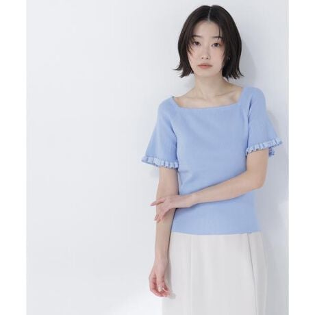 デコルテをキレイに見せるスクエアネックが上品な印象のニット。袖口のボーダーフリルがさりげない可愛らしさをプラスします。シンプルな身頃でパンツにもスカートにも相性抜群。コーディネートに取り入れると程よい華やかさを演出します。<素材>ドライタッチ素材のリブ編みニットです。<詳細>仕様・開閉なし裏地・なし透け感・なし / 光沢・なし / 伸縮性・あり生地の厚さ・普通※モデルの着用画像の場合、光の当たり具合により、実際の色味と異なって見えることがございます。色味は、商品単体の画像をご参照ください。