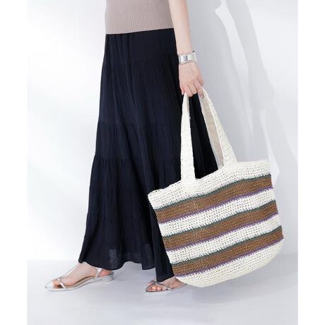 カラフルなペーパーヤーンをミックスボーダーに編み立てた夏らしいトートバッグ。季節感のある素材とカラーを手軽に取り入れられるアイテムです。A4サイズも収納でき、口元はマグネット仕様で閉じられるため、デイリー使いにも便利です。※モデルの着用画像の場合、光の当たり具合により、実際の色味と異なって見えることがございます。色味は、商品単体の画像をご参照ください。