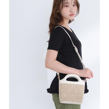 サークル型の持ち手が特徴のミニバケツバッグ。織り感のある天然素材風にはパールスタッズ、スウェード風にはハート型メタルスタッズをプラス。コンパクトながらポケットが充実し、ファスナー付きで安心です。ショルダーストラップでクロスボディ持ちとしても使えます。※モデルの着用画像の場合、光の当たり具合により、実際の色味と異なって見えることがございます。色味は、商品単体の画像をご参照ください。