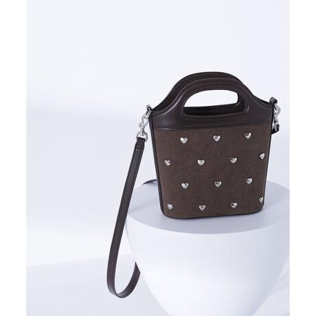 サークル型の持ち手が特徴のミニバケツバッグ。織り感のある天然素材風にはパールスタッズ、スウェード風にはハート型メタルスタッズをプラス。コンパクトながらポケットが充実し、ファスナー付きで安心です。ショルダーストラップでクロスボディ持ちとしても使えます。※モデルの着用画像の場合、光の当たり具合により、実際の色味と異なって見えることがございます。色味は、商品単体の画像をご参照ください。