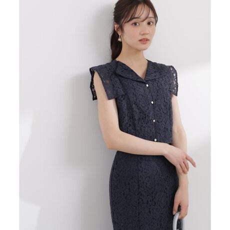 オープンカラーが女性らしいレースブラウス。ゴールドカラー釦がさりげないアクセントになっています。二の腕を華奢に見せるラインと、コンパクトな短丈シルエットもポイント。フェミニンなスカートからカジュアルなデニムまで、幅広いコーディネートに着回せます。同シリーズのスカートとのセットアップもおすすめです。