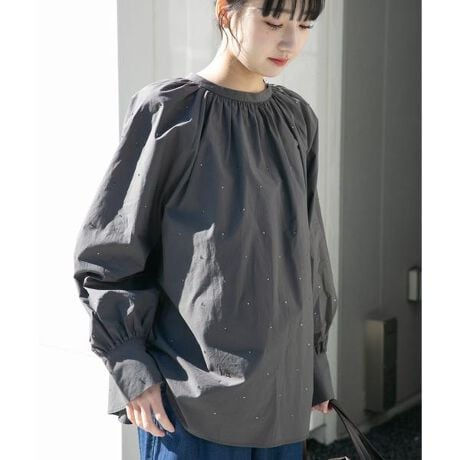 小粒のラインストーンをあしらった、さりげない華やかさが魅力の2WAYブラウス。フロントから袖にかけて散りばめられたラインストーンが、動くたびに上品にきらめき、顔周りを明るく演出します。リボンタイを前後どちらにしても着用でき、その日の気分やスタイリングに合わせて印象を変えられるのもポイント。袖口のシャーリングが柔らかなシルエットを作り、デイリーからきれいめシーンまで幅広く活躍する一枚です。