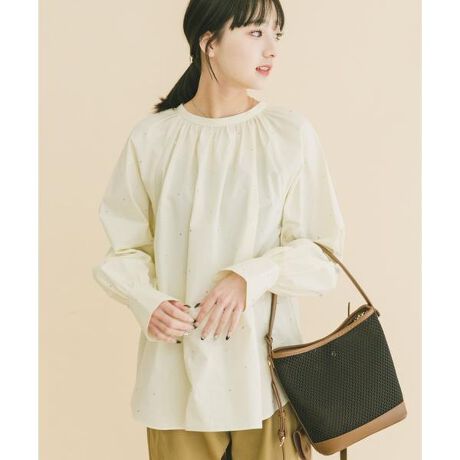 小粒のラインストーンをあしらった、さりげない華やかさが魅力の2WAYブラウス。フロントから袖にかけて散りばめられたラインストーンが、動くたびに上品にきらめき、顔周りを明るく演出します。リボンタイを前後どちらにしても着用でき、その日の気分やスタイリングに合わせて印象を変えられるのもポイント。袖口のシャーリングが柔らかなシルエットを作り、デイリーからきれいめシーンまで幅広く活躍する一枚です。
