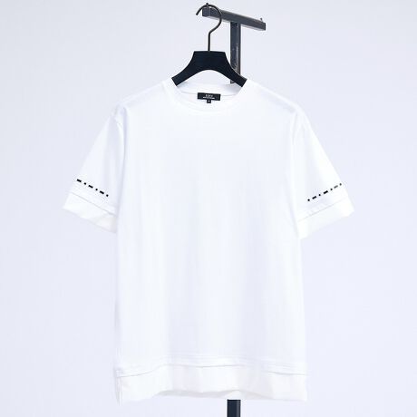 袖口と裾口にレイヤーデザインで合成皮革をあしらったクルーネックTシャツ。袖口にはスクエア型のミラーストーンスタッズを採用し、さりげないアクセントを加えた新しいデザインに仕上げています。