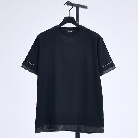 袖口と裾口にレイヤーデザインで合成皮革をあしらったクルーネックTシャツ。袖口にはスクエア型のミラーストーンスタッズを採用し、さりげないアクセントを加えた新しいデザインに仕上げています。