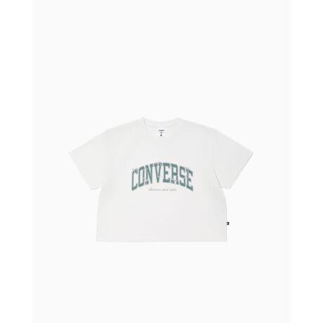 [型番:87312492]吸汗速乾、UVカット機能のあるコットン 70 ポリエステル 30の生地を使用。ラウンドロゴにリボン要素を取り入れたクロップド丈グラフィックTEE。【42300440】