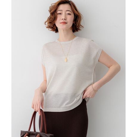 肩先を優しく包み込むような、少し幅を持たせたデザインが特徴のノースリーブプルオーバーです。ボディラインに程よく沿うすっきりとしたサイズ感で、一枚着としてはもちろん、ジャケットやカーディガンのインナーとしてももたつかずに着用いただけます。透け感を程よく抑えているため品があり、キャミソールドレスとのレイヤードスタイルや、ワイドパンツと合わせたきれいめスタイルなど、オンオフ問わずマルチに活躍する一枚です。カラーは、清涼感あふれるホワイト(#001)、柔らかなニュアンスのアイボリー(#003)、女性らしいベージュ(#033)、コーディネートのアクセントになるブルー(#070)、知的な印象のネイビー(#075)の5色展開です。