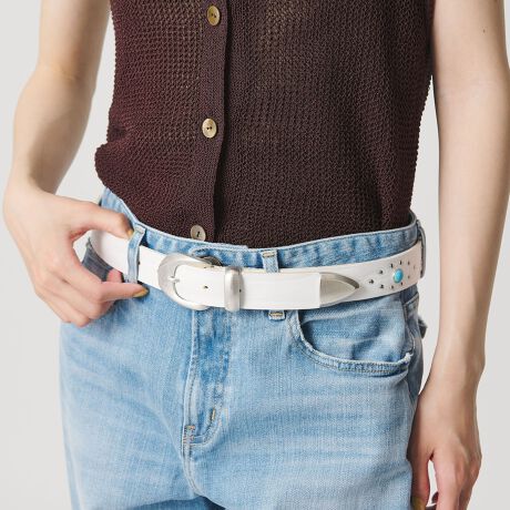 縫い目のないすっきりとしたレザーにスタッズディテールが目を惹くベルト。