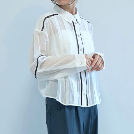[型番:161310]2種類のレースを使い、変わりタックをランダムに施したブラウスシリーズです。同色と配色で違った雰囲気を楽しめます。シャツとしても、ショート丈の羽織としても使えるアイテムです。※商品画像は光の当たり具合などにより実際の色味と異なって見える場合があります。エトレリー etre relie