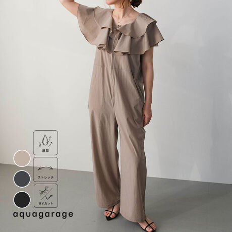 紫外線から肌を守ってくれるラッシュガード素材を使用した、水陸両用タイプのオールインワン。