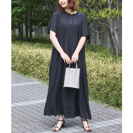 胸元のアーチ型切替デザインが印象的な、軽やかなギャザーワンピース。